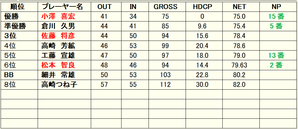 1組;高崎 芳絋(千、S39学電)、 細井 常雄(千、48 学金)、工藤 宣雄(千、ゲスト)、 小澤 喜宏(東、S53学子) 2組;倉川久男(千、S52学金)、佐藤 将彦(東、S43学子)、松本 智良(東、S62院建)、 高崎つね子(千、ゲスト) *注釈 千:千葉県支部、埼:埼玉支部、東:東京支部 |