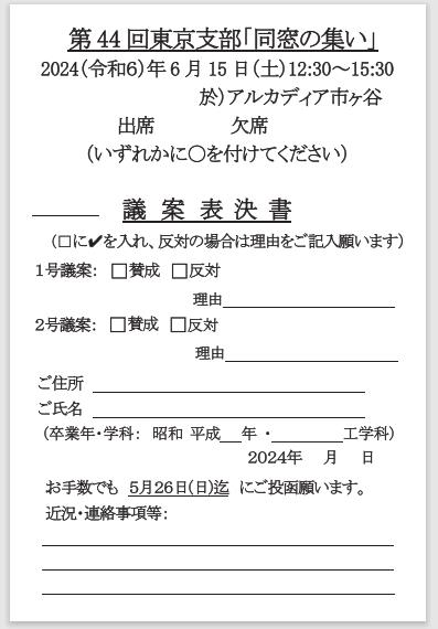 【同窓の集い】の開催に伴って、「出欠可否」と下記議案について、書面にての採決を行う、 書面表決とさせていただくようお願いいたします。