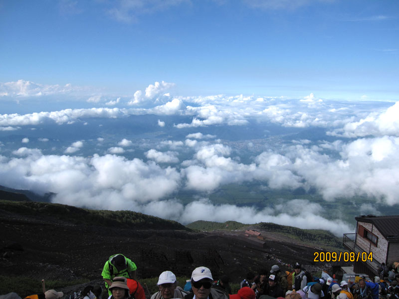 15:35「七合目トモエ館」でトイレ休憩後15:45出発。鎖付きの急な登り坂続く。16:45"本七合目"。晴れが続く。美しい雲海の合間に下界が見ゆ。小田原も。登山の速度やや早まる。17:00小休止。次第に風寒し。17:45八合目(3,020m)、小休止5分。穏やかな好天続く(気象庁の天候予報は完全に"良い方向"にハズレた!)急坂を登る。雲海が益々美しい!