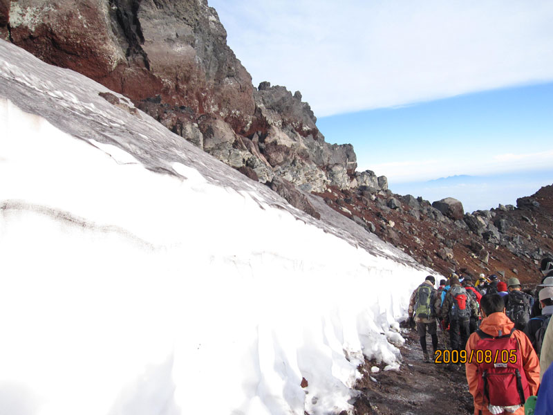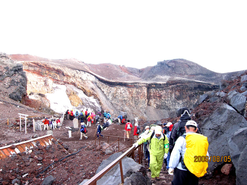 5:05「お鉢巡り」に出発。19名。好天続く。時計回り。お鉢の中に万年雪を見る。浅間大社奥宮を過ぎると、南アルプス、八ヶ岳、中央アルプスの山々がパノラマで展開。学生時代に登った山ばかりで懐かしい!「剣が峰」で日本最高地点の三角点(3775.6m)を確認。